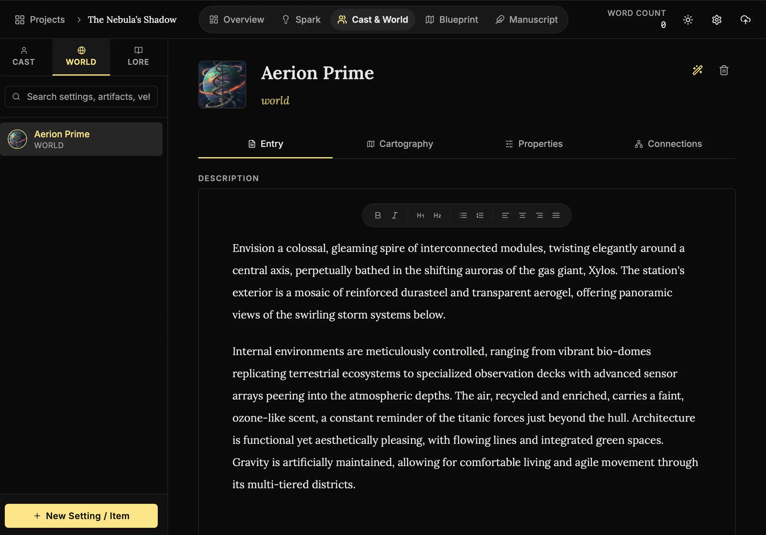 In the sidebar, click the “World” tab (next to Cast). - Create a New Setting: