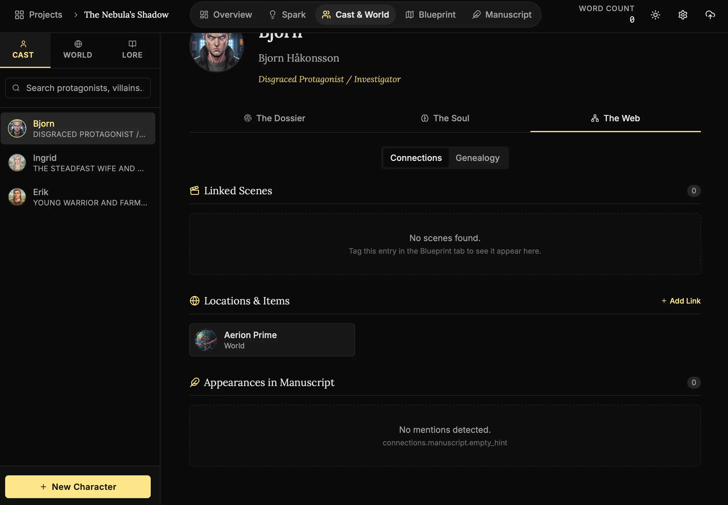 Open a character dossier and click “The Web” -> “Connections”. - Add a Link: