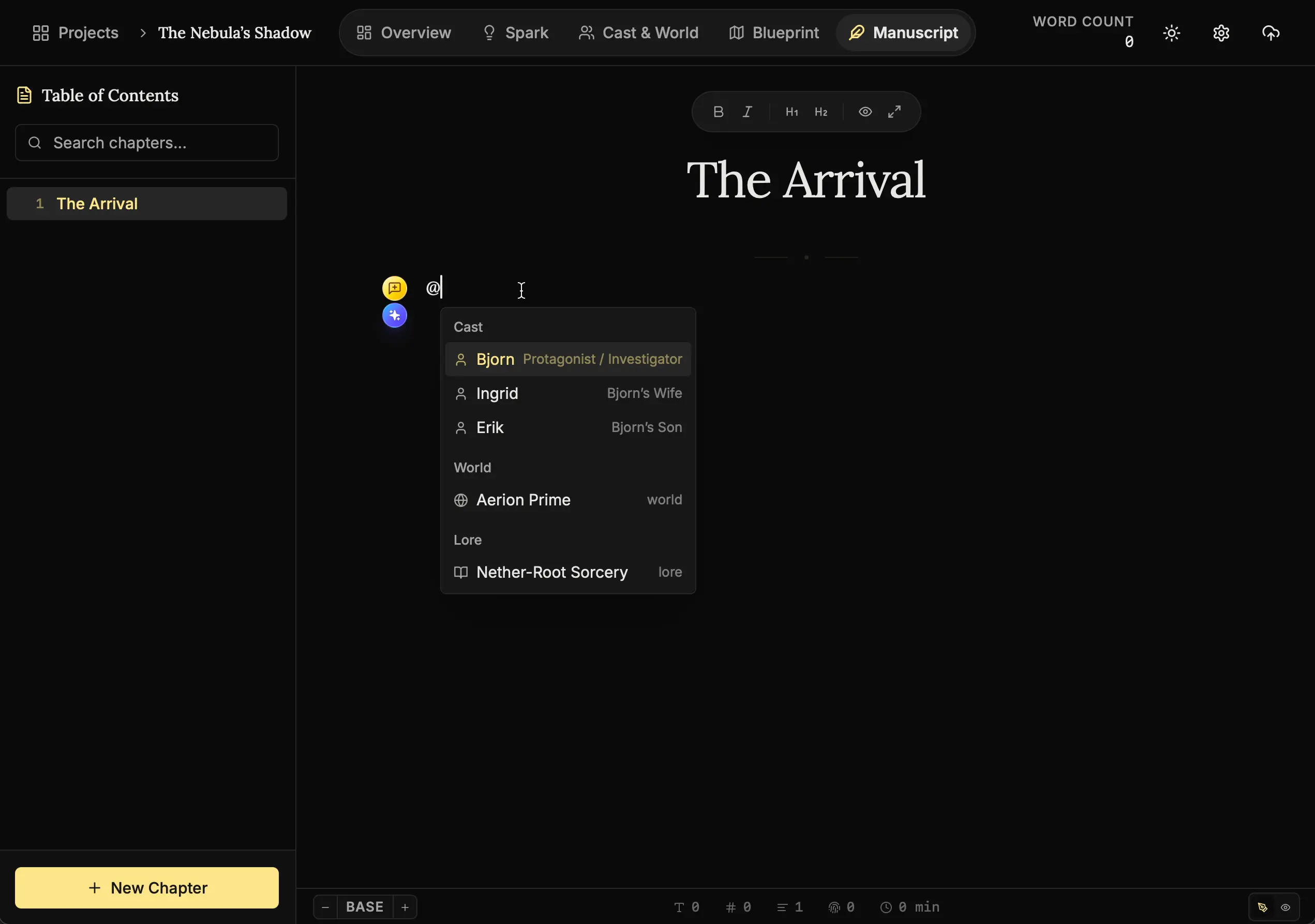 A dropdown list of your Cast, World, and Lore appears. Select the entity (e.g., The Iron City or Bjorn). - Result: