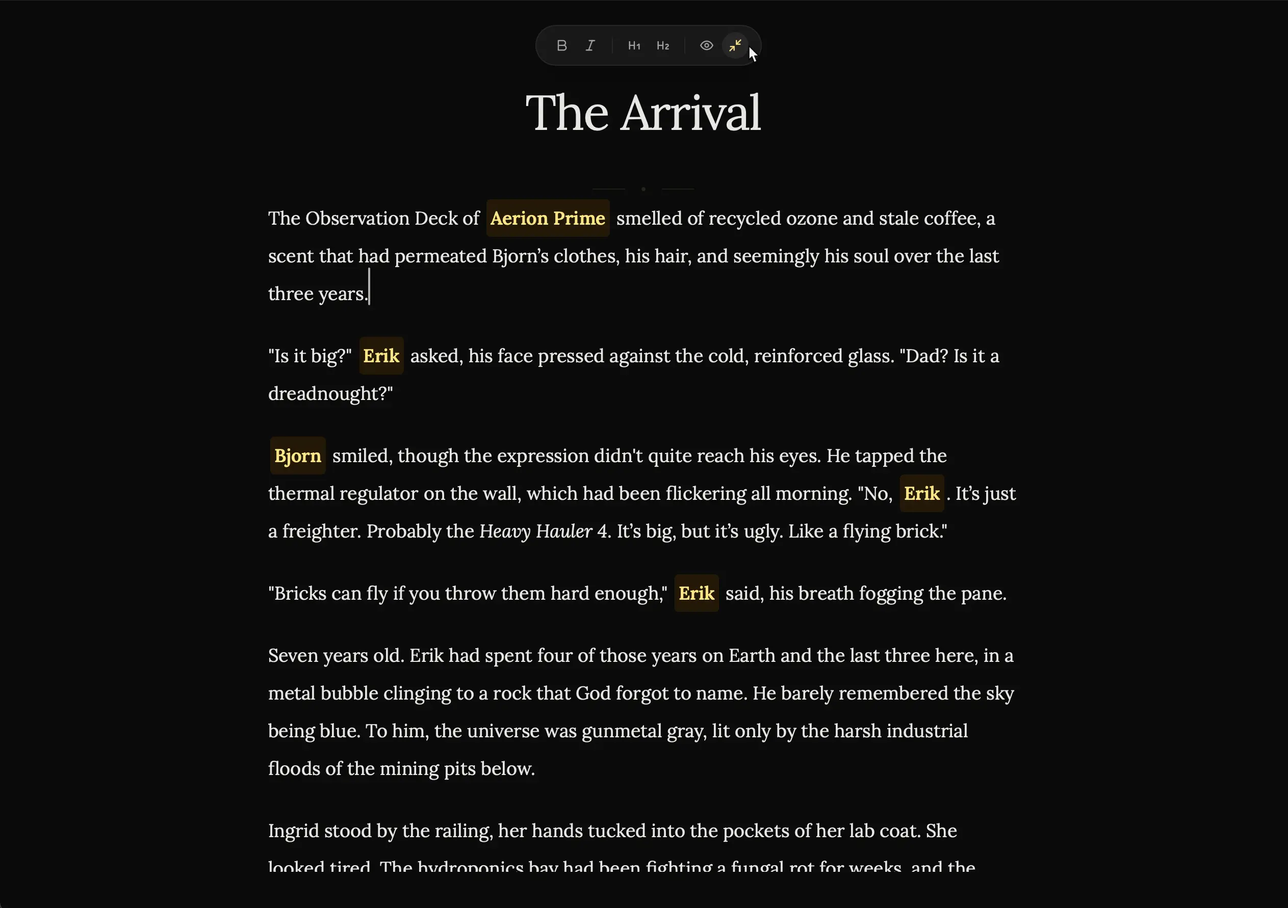 It acts as an instant memory aid. If you forget a character’s eye color or a city’s population while writing, just hover over the name. You don’t need to leave the editor to check your notes.