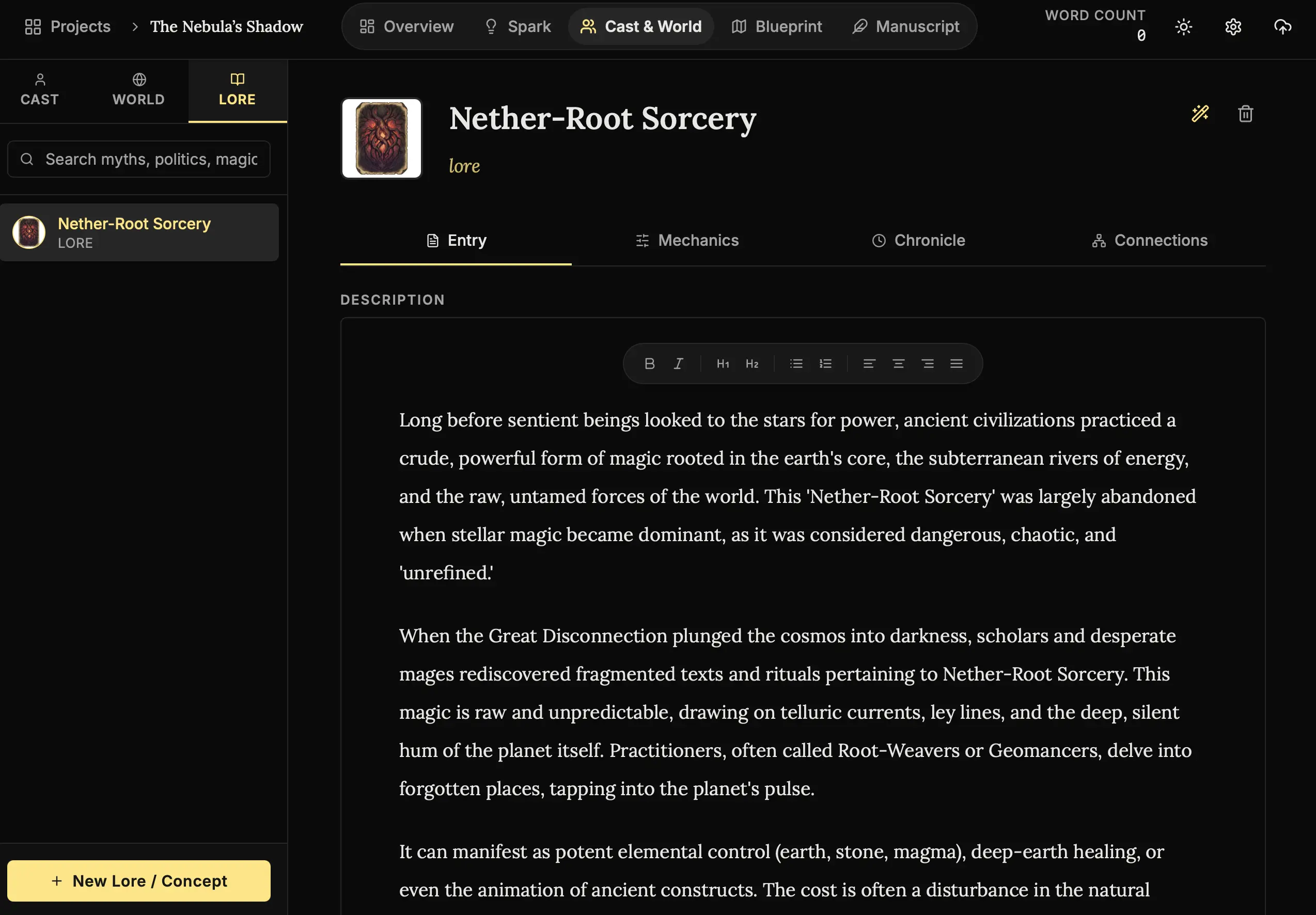 Go to Cast & World -> Lore. Create a new entry (e.g., “Blood Magic”). - Switch to Mechanics: