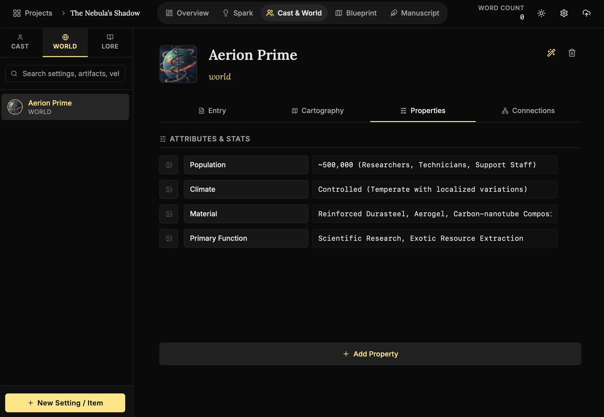 Navigate to Cast & World -> World. Open a location you created (e.g., “The Iron City”). - Switch to Properties: