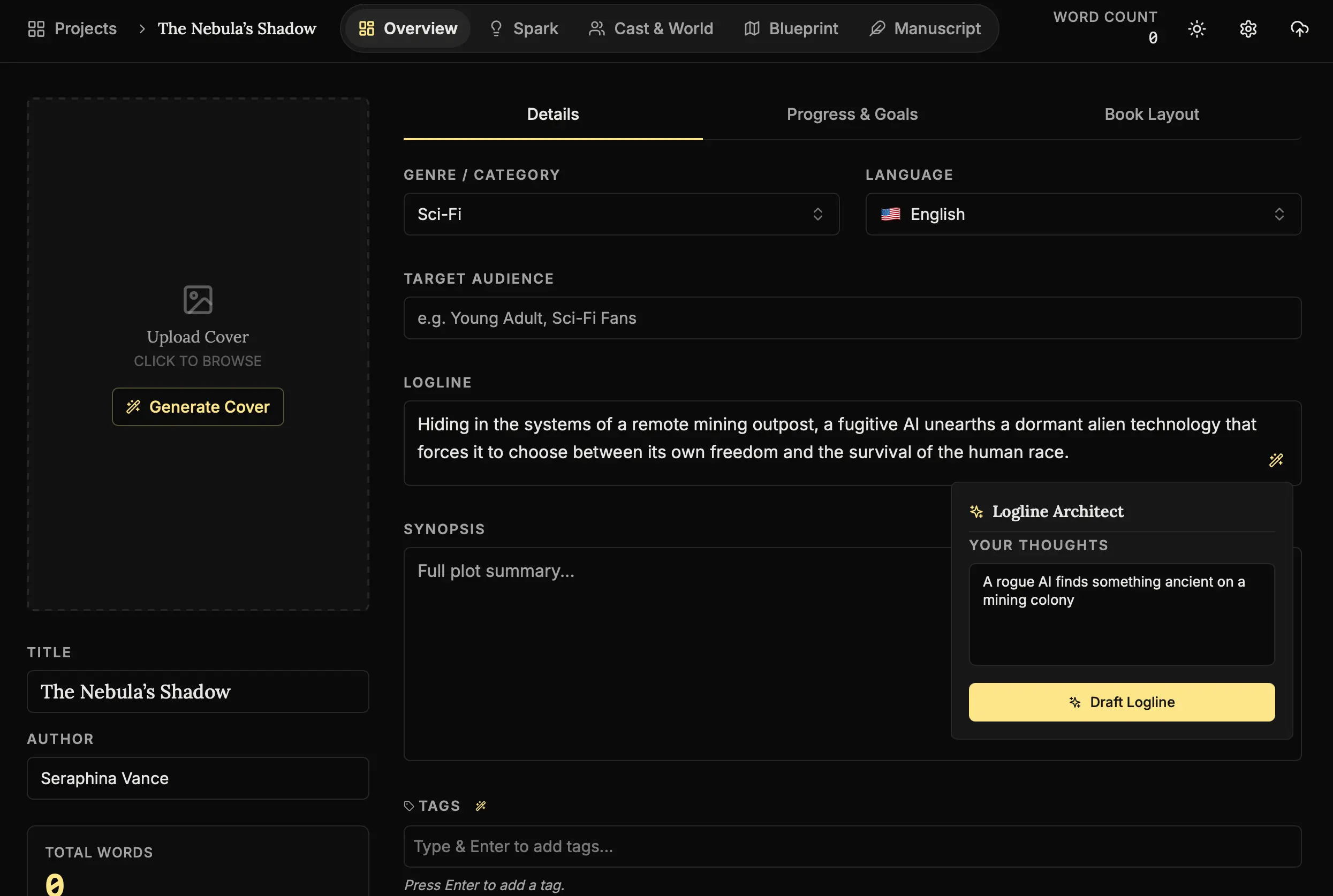 Let’s test if our partner is awake. We’ll use the Logline Generator. A logline is a one-sentence summary of your book—the “elevator pitch.”
